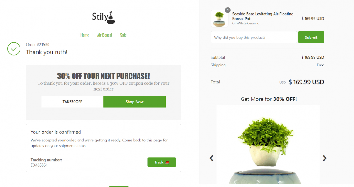One of the low-hanging fruits to target here is to optimize your Thank You page so as to display all products that a customer might have missed while browsing through the BFCM deals. This is an opportunity for you to showcase related products in the category, best-running offers, popular products, and much more to customers who’ve just made a purchase. Since they have already bought from you, they trust your store and will most likely repurchase if they find something enticing enough.