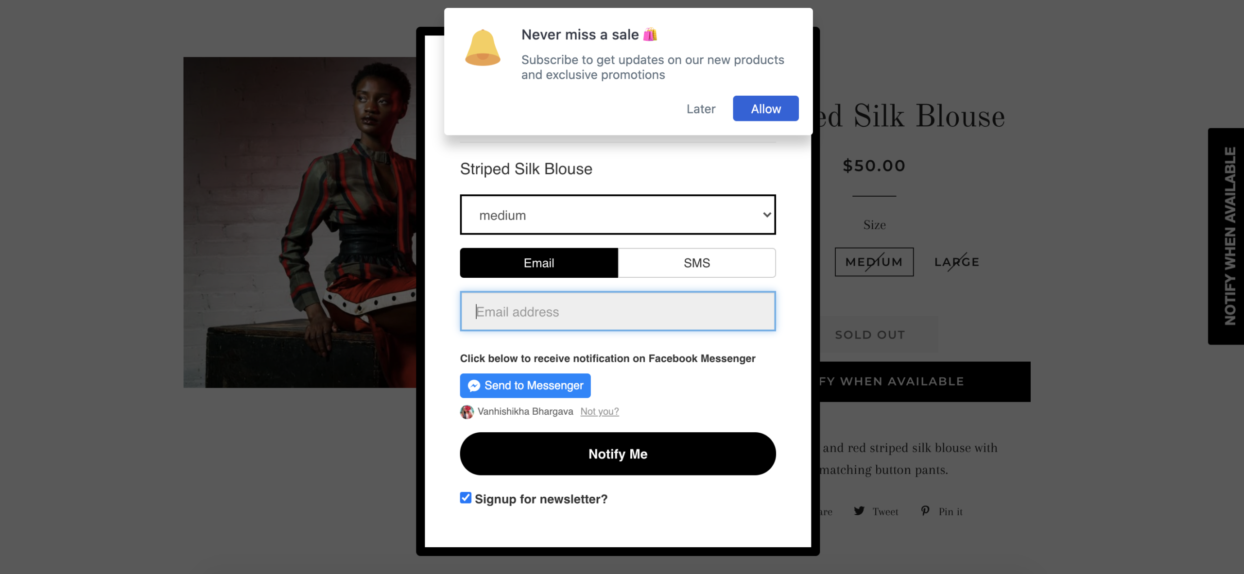 To make sure your restock alerts don’t get missed, you need to reach out to the shopper across various channels – SMS, email, Facebook Messenger, or even web push notifications. You want to ensure that your message does not get lost in the BFCM frenzy.