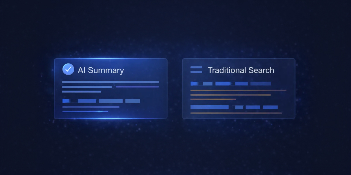 Comparison graphic showing AI Summary and Traditional Search result formats, illustrating how web clicks may change when AI summaries appear in search results.