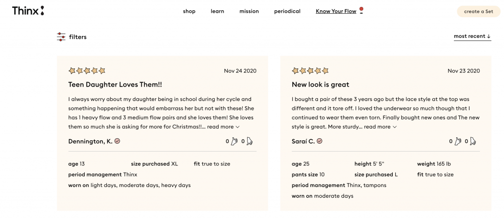 As a product that is innovative and unheard-of for many shoppers, Thinx has set up a dedicated reviews and testimonials page where shoppers can see how customers feel about the product, including details about the customers so that they can see what people of their age and size, and with similar needs have to say about the product.