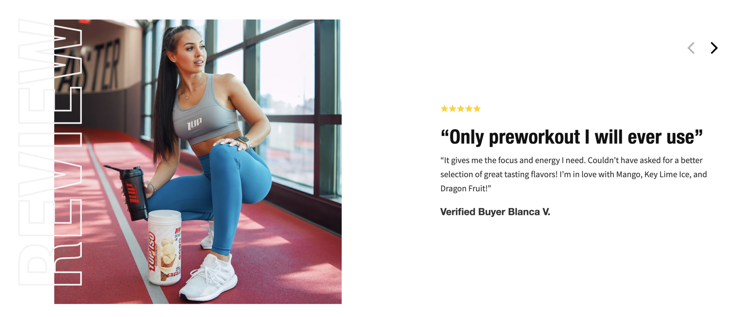 1UpNutrition sells top diet sports nutrition products for all fitness levels. To showcase how their customers benefit from their products, the brand has a slider on its homepage that store visitors can swipe through.