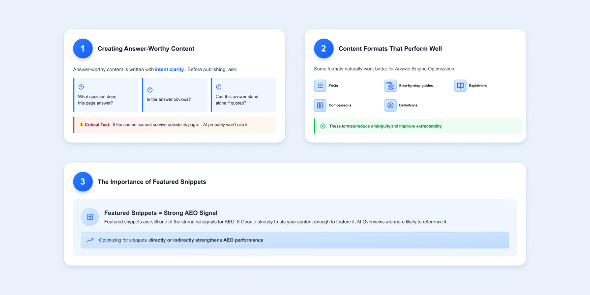 Answer-worthy content is written with intent clarity. Before publishing, ask… what question does this page answer? Is the answer obvious? Can this answer stand alone if quoted?