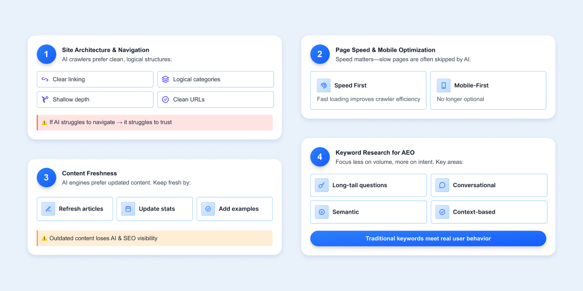 AI crawlers prefer user-friendly UI/UX and clean and logical site structures. Good architecture includes clear internal linking, logical categories, shallow click depth, and searchable and clutter-free URLs.
