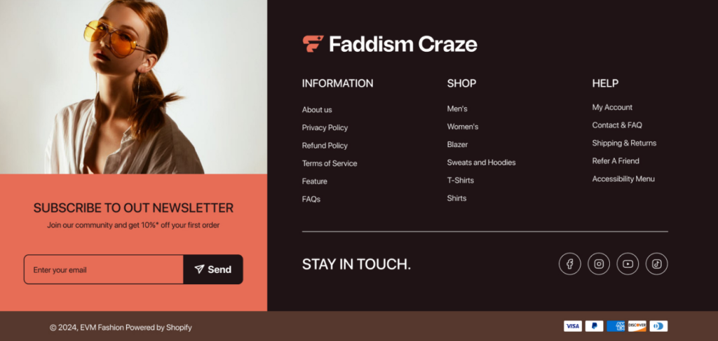 - Footer: Design the footer with brand color, fonts, and elements only. Link the important pages along with product categories, contact us, about us, policies, shipping and returns. Also include Google location, address, contact details, social icons, and copyright icons.