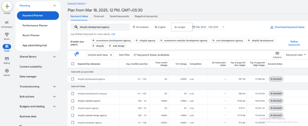 A snapshot from Keyword Planner.