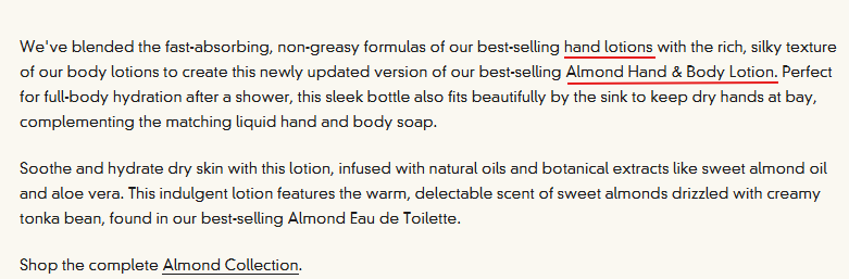 Here is an example of product description for hand lotions. In the screenshot the primary keyword is hand lotions and the secondary keyword is hand and body lotion.