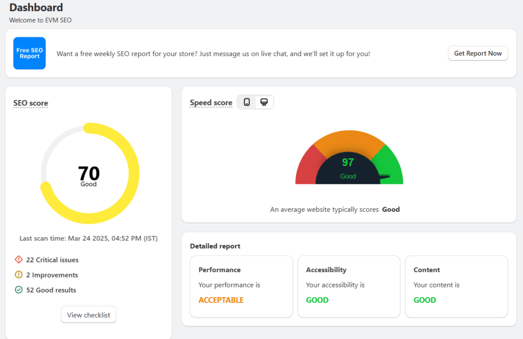 There are many apps available to scan your store for SEO issues. One of the most preferred apps is SEO Expert Pro—SEO Optimizer. It scans your store and provide you with the details of what issues are there. It even lets you add meta titles and meta descriptions for your products. You can try other apps as well.