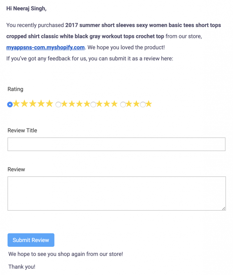 When sending an email asking for product reviews, don’t forget to show personalized product recommendations so that you create more opportunities for engagement on your Shopify store. Even if the customer chooses to not leave a review, they will see recommendations of products that are related to the item they bought.